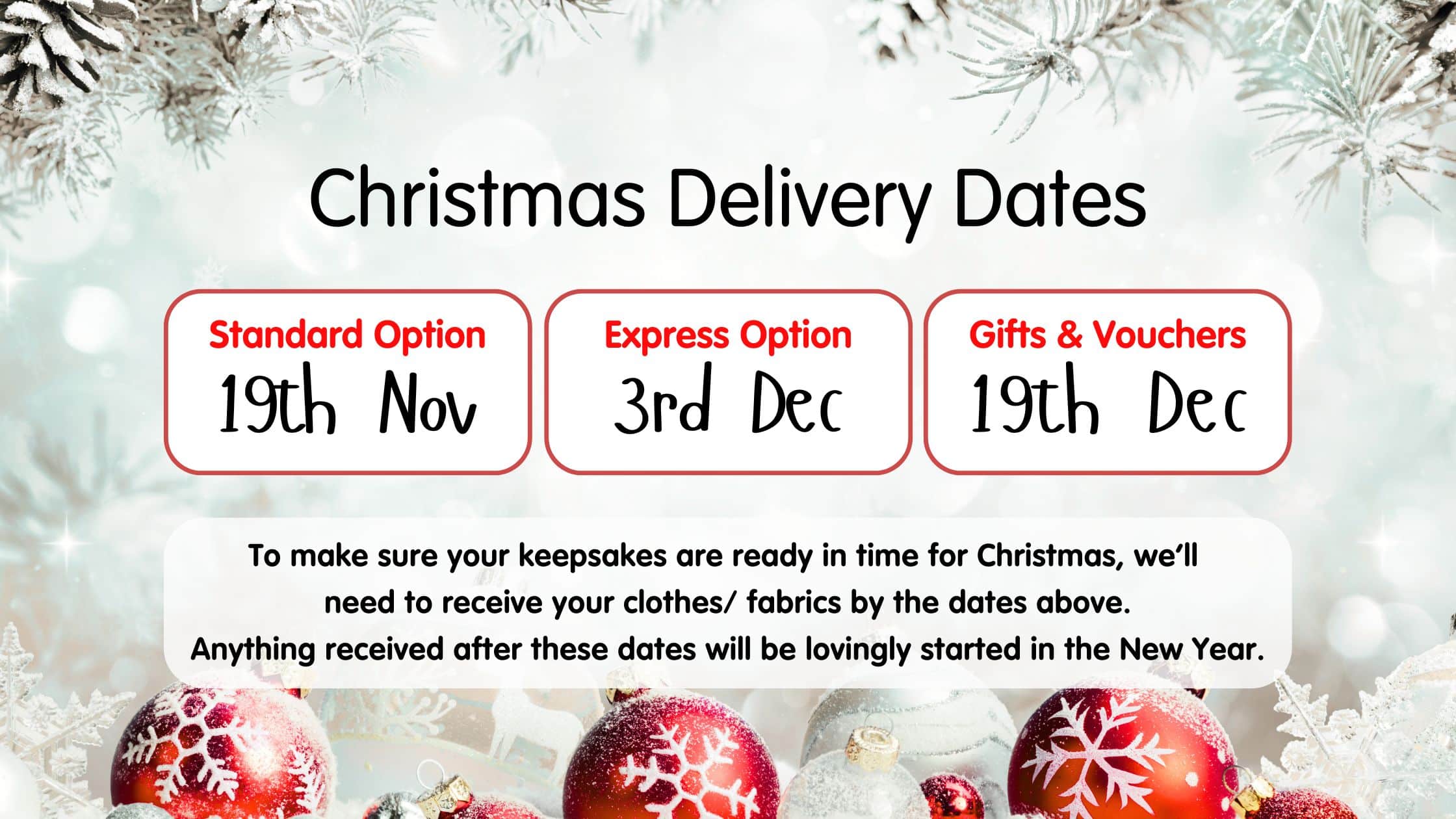 As the festive season approaches, it’s the perfect time to start planning ahead. To make sure your beautiful keepsakes arrive in time for Christmas, we kindly ask that you send in your orders and clothing as early as possible. The weeks leading up to Christmas are our busiest time of year, and we want to ensure each item gets the care and attention it deserves.