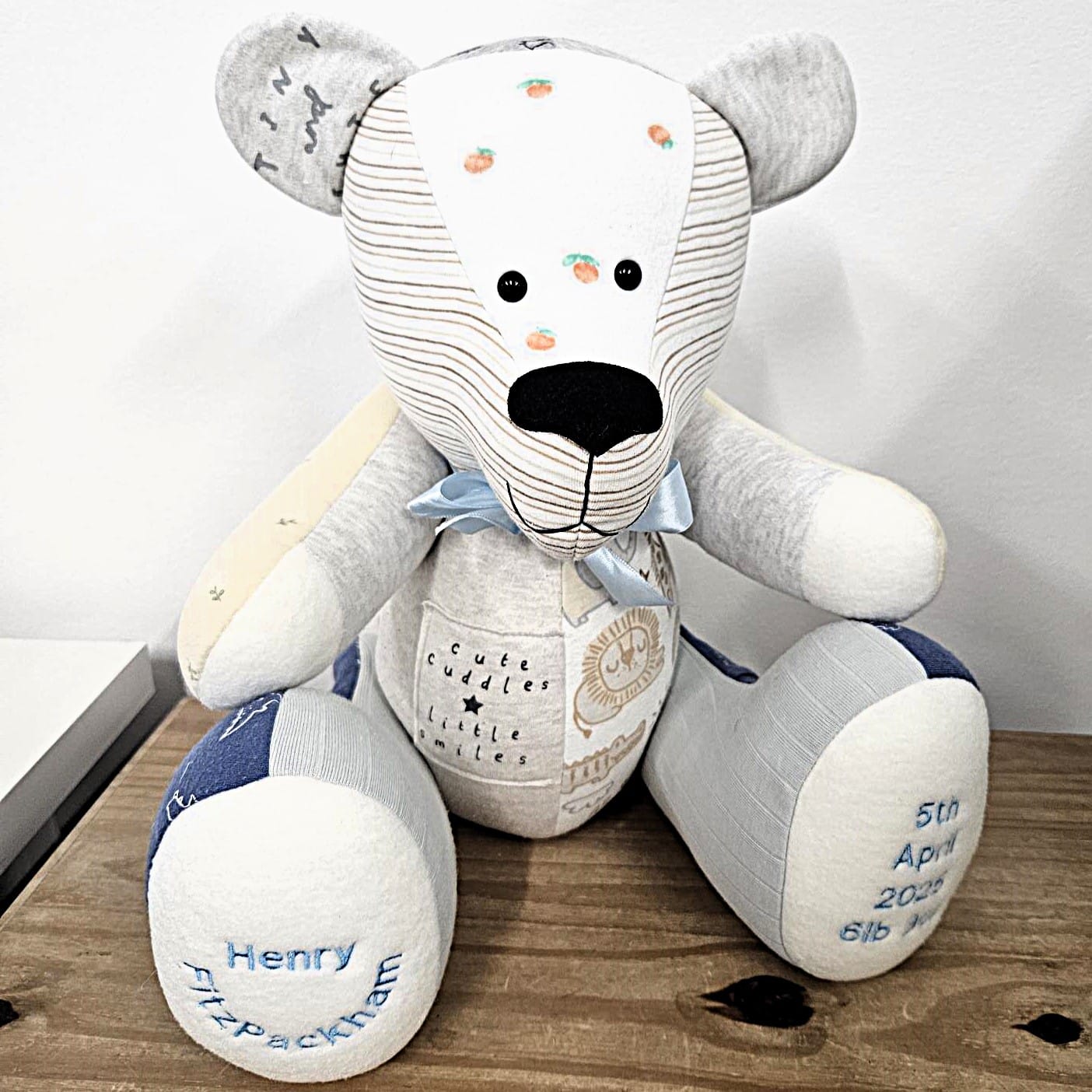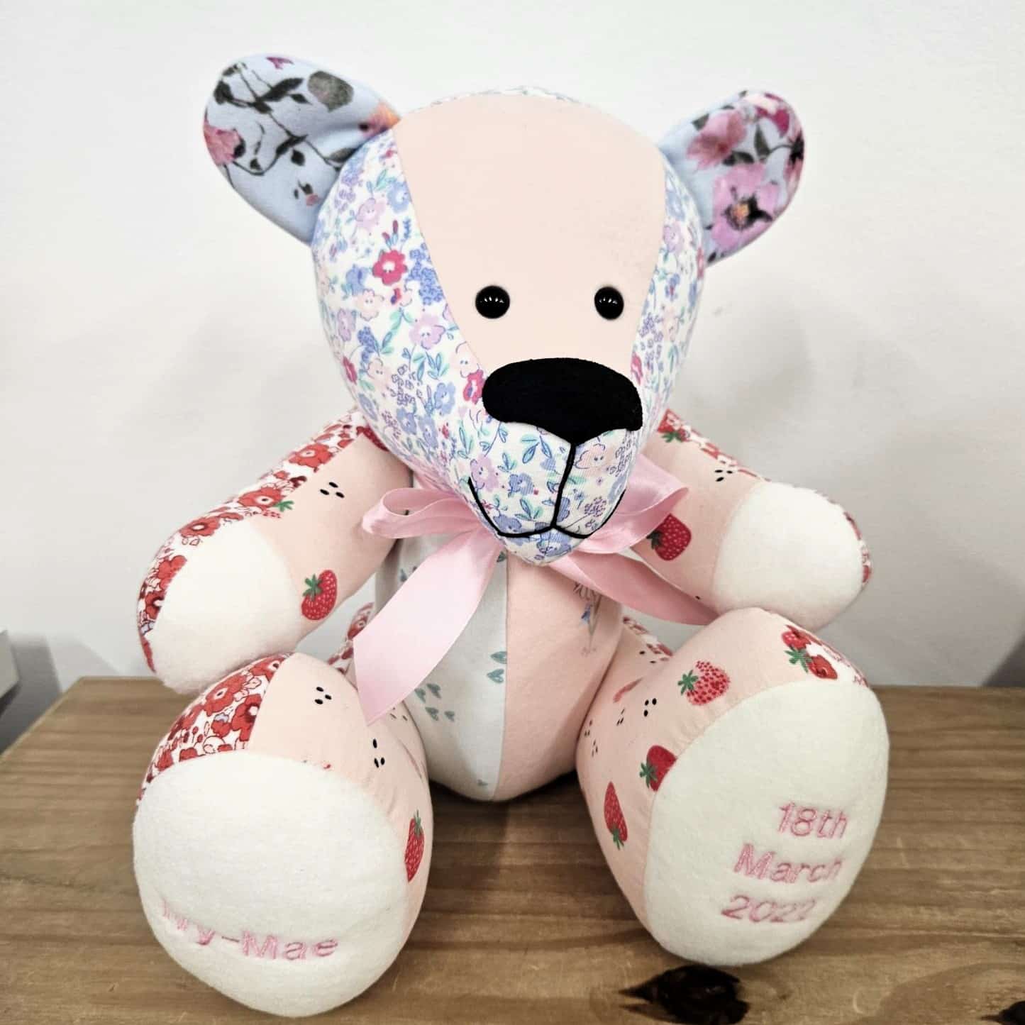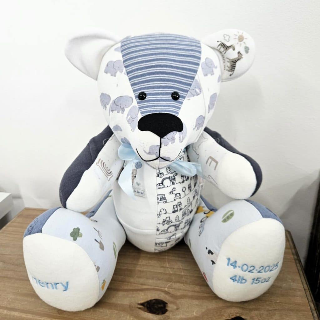 It’s no surprise that baby’s grow at an alarming rate, and it can be hard to keep up! One of the most heartfelt and sustainable ways you can recycle your baby’s old clothes is to repurpose them into a keepsake memory bear. It doesn’t have to just be baby grows; we can use mittens, bibs, vests, and more. Our memory bears come in two sizes; the larger of which can be weighted to match your baby’s birth weight. Add another dash of uniqueness with their birthday, or ‘baby’s first Christmas’ text.