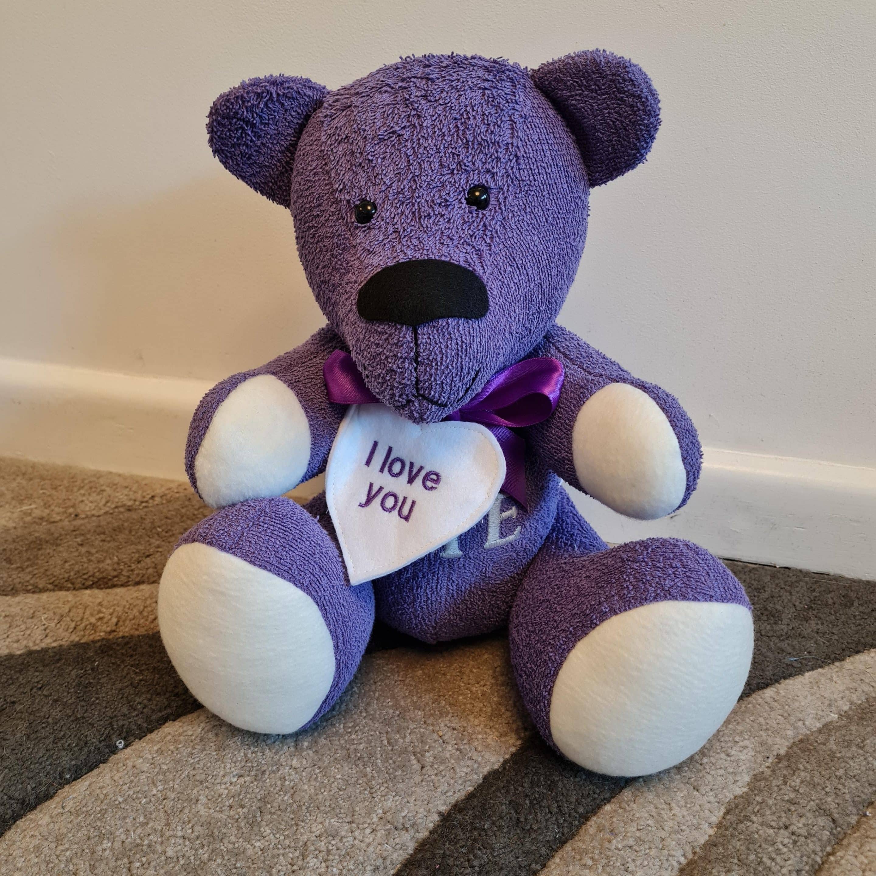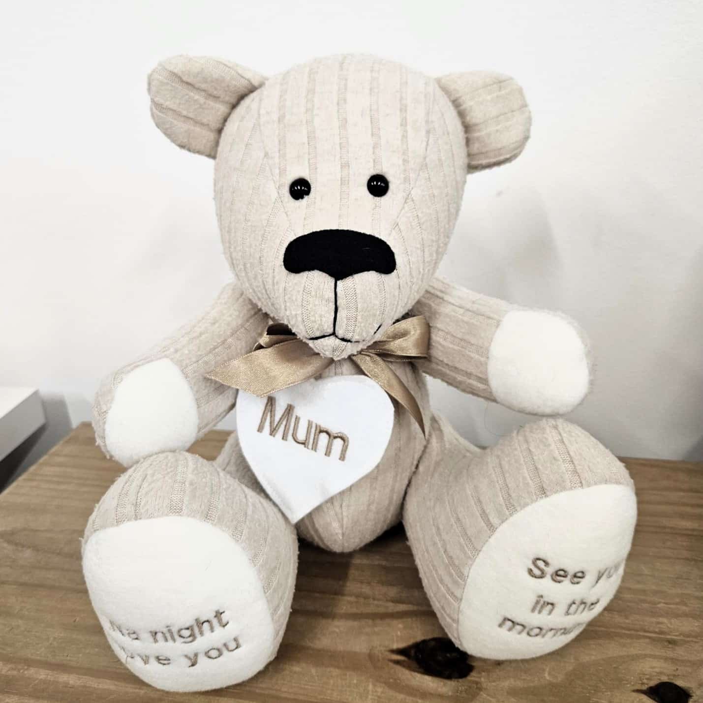 Our Keepsake Memory Bear is truly a timeless gift to help you to forever cherish your precious memories. Made using sentimental clothing and fabrics that you just can’t part with, our memory bears are a tactile and magical way to keep your memories alive forever. Our keepsake bears can be made from baby clothes, adult clothes or textiles and are lovingly handmade, using our bespoke patterns. Whether you’ve got a bundle of babygrows, a beloved jumper or several t-shirts you’d like us to transform, we can use a single item of adults clothing or several different items of clothing to create a unique design. Our keepsake teddies are all finished to a high standard, with wooden button joints on the limbs, durable stitching and quality construction. You can also personalise your Keepsake Memory Bear, to create a truly unique gift. Choose from our range of adorable accessories, a embroidered heart to sit around the bear’s neck or personalised embroidery on the bear’s paws. We can make a range of cute accessories for our memory bears, including:
