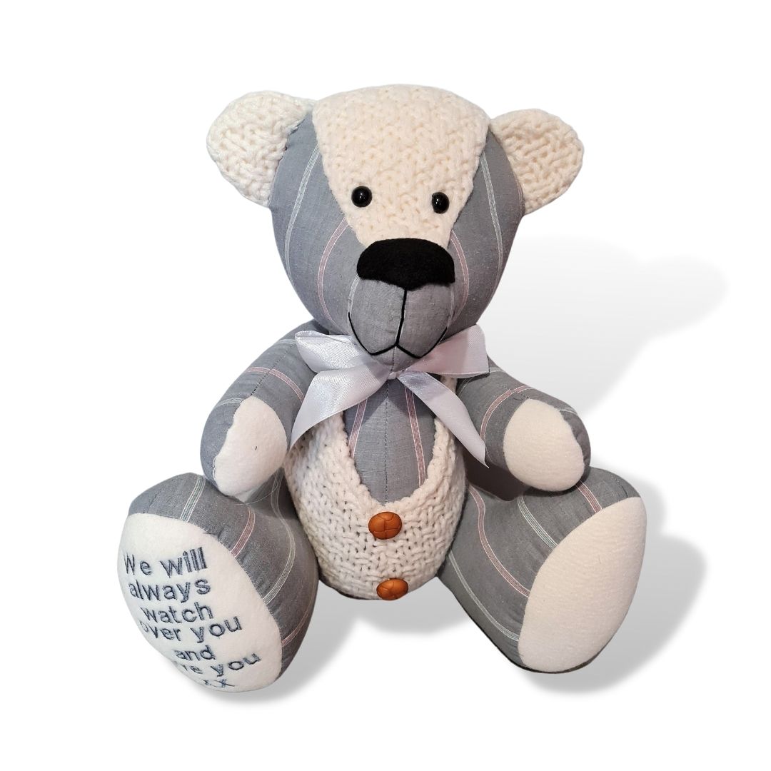 Made from fabrics or clothing of your choice, a memory bear is a fantastic way to repurpose sentimental items you just can’t bear to part with and create a fond reminder of times gone by. Whether you want to use adult clothes, baby clothes or special textiles, we can make your keepsake bear from the items of your choice, in any colour or pattern that you wish! Made using our own unique patterns, our keepsake teddies are hand-made and finished to the highest possible standards, with wooden button joints at the limbs, durable stitching and quality construction.