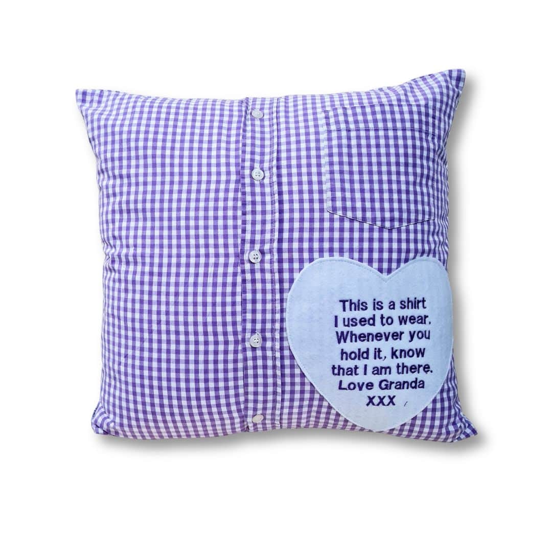 Our keepsake memory cushions made from shirts beautifully capture your memories by using an item of clothing belonging to a loved one, they cannot only be made from shirts we can also use jumpers, pyjamas, jeans and t-shirts.