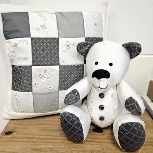 Our wedding dress memory bear and cushion bundle is a gorgeous and unique way to make the most from your wedding dress. You can repurpose your wedding dress into two timeless treasures that will be perfect for displaying in your home.