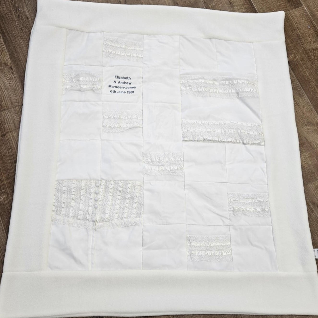 A fabulous anniversary gift, this handmade keepsake blanket is perfect for hanging on a wall or used to snuggle under on the sofa. With a soft and cosy cream polar fleece fabric backing and border, our memory blankets are a unique, tactile and breathtakingly beautiful way to upcycle your wedding dress. Whether your wedding dress is made from silk, taffeta, lace, charmeuse, chiffon or mikado, we can transform your gown into a keepsake you’ll cherish for decades to come.