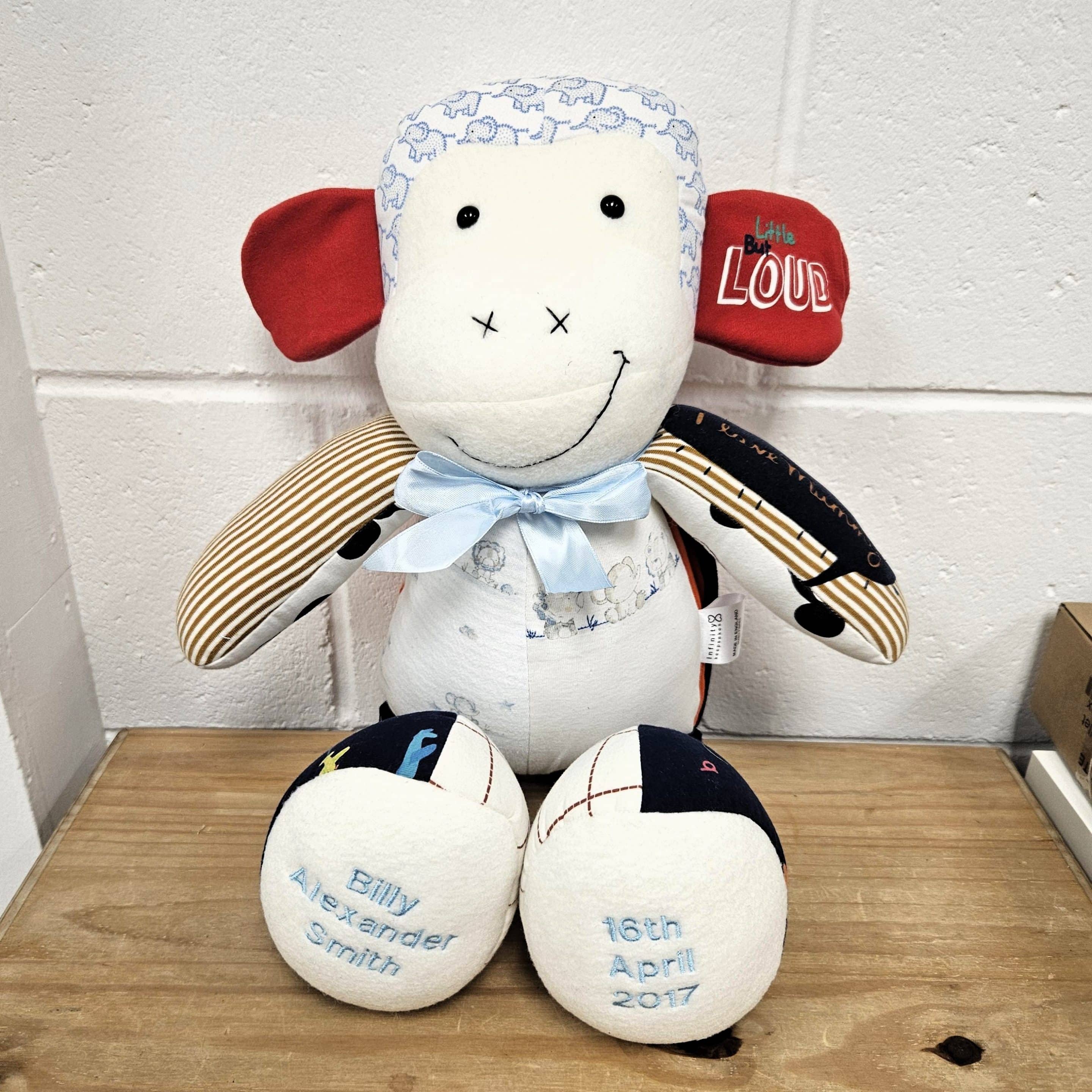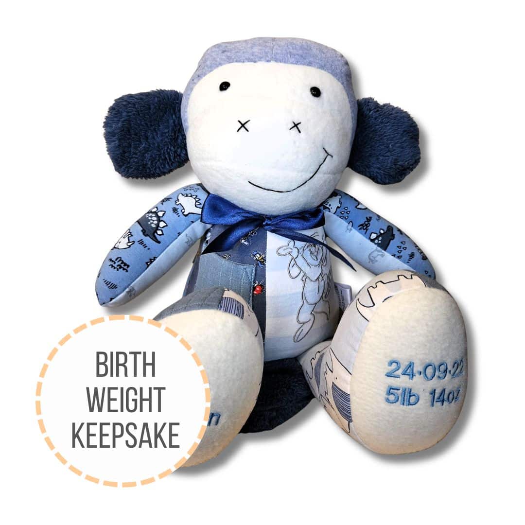 Our cheeky weighted monkey keepsake is a gorgeous keepsake made from your most precious baby clothes and weighted to your child’s birth weight.